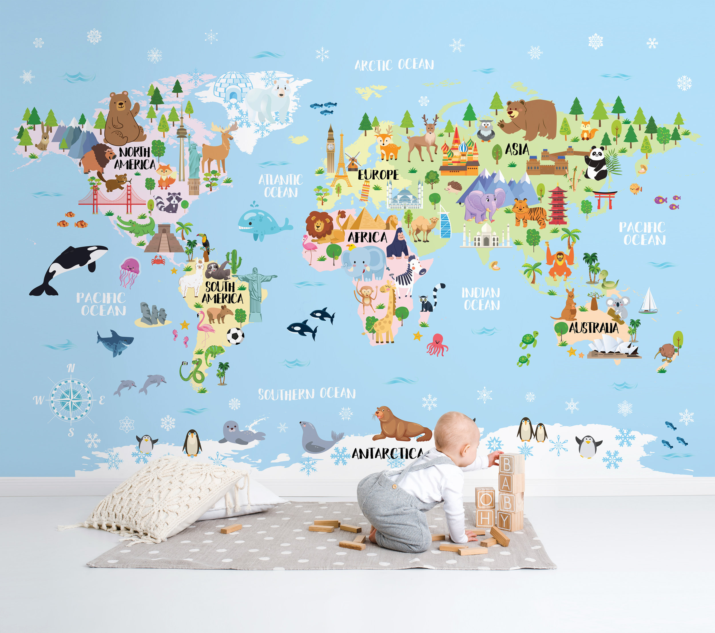 Animal World Map Wallpaper Kids Room Decor Playroom Map Wall